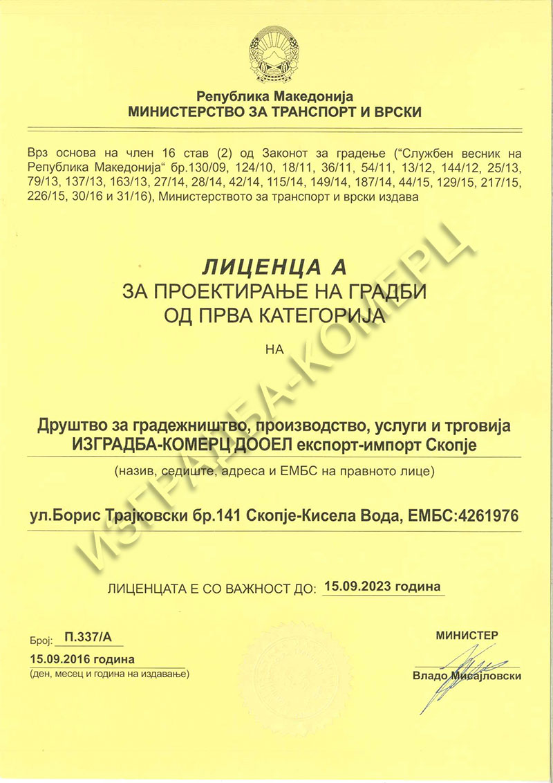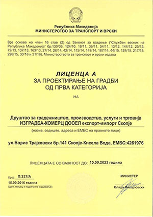 ЛИЦЕНЦИ А - ЗА ИЗВЕДБА И ПРОЕКТИРАЊЕ